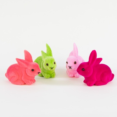 Easter rabbit and bunny figurines of various sizes – from tiny rabbits with fur to large, flocked hares. Both sitting and standing variants available, featuring natural colours.