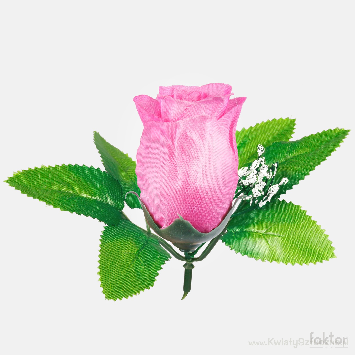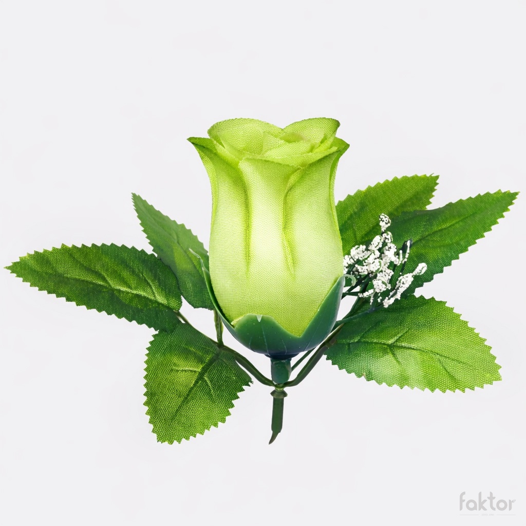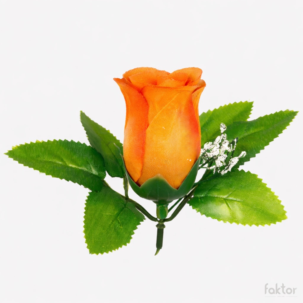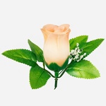 A rosebud head with the addition of leaves and decorated with gypsophila. It comes in many colours, and two-tone shades.