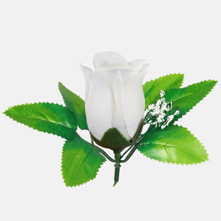 A rosebud head with the addition of leaves and decorated with gypsophila. It comes in many colours, and two-tone shades.