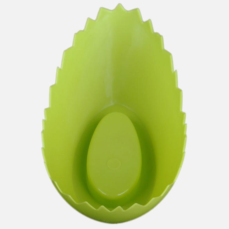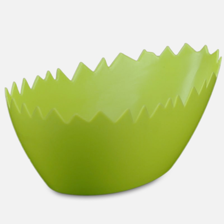 A plastic pot cover with an oval base and a top resembling a cracked egg. Available in spring colours.